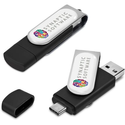 Classic flash drive with a black, soft-touch, lacquered base and a metal swivel in a choice of colours. It has 16GB of memory, with a USB 2.0 interface.