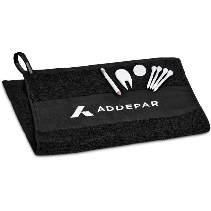 This neatly packaged golf set is a great gift for golf days. It includes a 400g/m2 cotton golf towel, mini pencil with eraser, divot tool, ball marker and four golf tees.