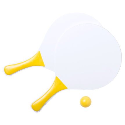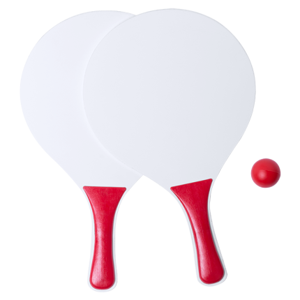 - Pair of beach rackets in white and natural wood.