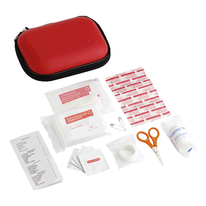 - First aid kit: 1 sterile non-woven pad, 1 bandage roll, 1 triangle bandage, 2 safety pins, a pair of scissors, 4 alcohol pads, 5 adhesive sterile plasters, 1 small roll of tape