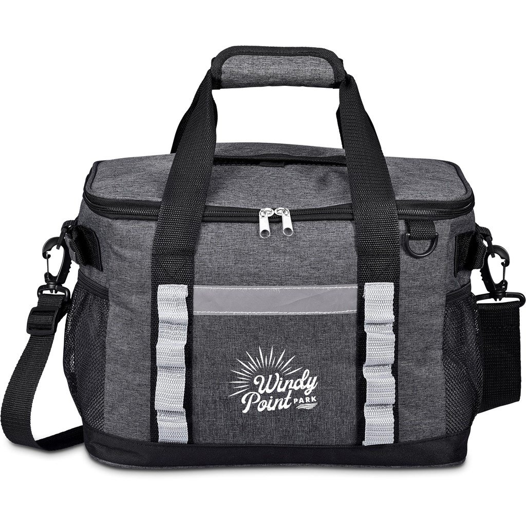 Elegant with beautiful black and grey contrast. Holds up to 24 cans. Main zippered compartment with PEVA lining. Front pocket with flap. Side mesh pocket. Double reinforced handles with Velcro handle wrap. Adjustable shoulder strap. Recessed plaque for domed sticker application attached to cooler.
