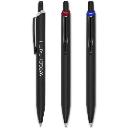 This metal ball pen has a matte black top coating with a chrome underlay. The shiny underlay matches the trim accent of the pen, and is revealed when your logo is engraved on the barrel. The ball pen refill contains good quality, black German ink and will provide smooth, uninterrupted writing for a minimum of 1,500 metres. Presented in a black PU pen pouch.