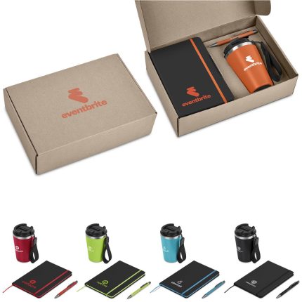 A stainless steel & plastic double-wall tumbler with a secure, screw-on lid and an optional carry loop is combined with an A5 hard cover notebook and a metal ball pen in a kraft gift box. The pen has a soft, matte finish and reveals a matte, light grey finish when lasered. This set is suitable as a client gift, or for staff and onboarding of new members to the team. A pre-packaged gift set not only looks impressive, but can also be a convenient and practical option when it comes to transport and delivery.
