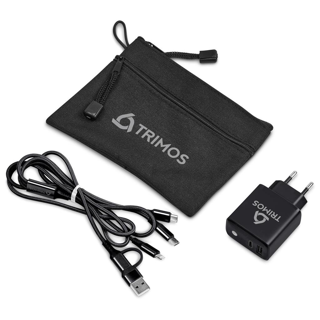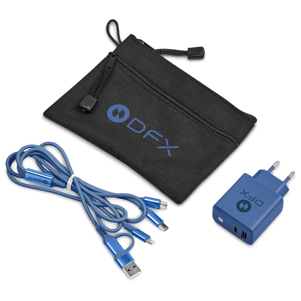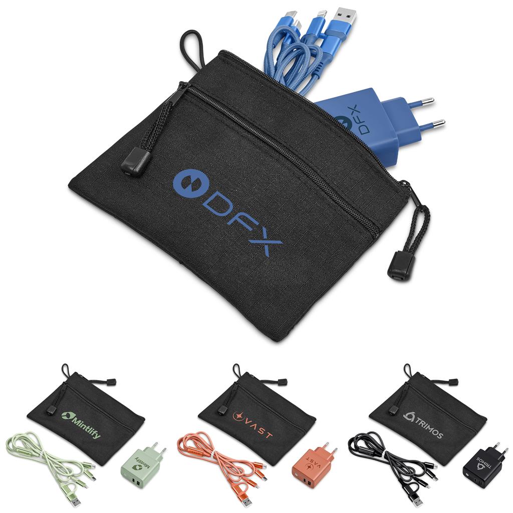 This handy charging set consists of a matching fast wall charger and a fast charge multi-cable, packaged in a handy zippered pouch.