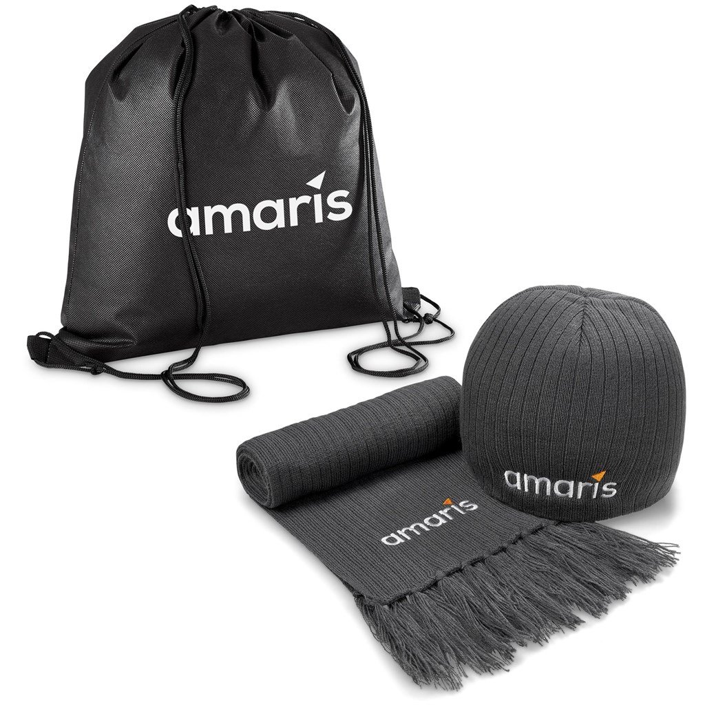 Stay warm this Winter, or in the outdoors, with this cosy scarf and beanie, packaged together in a drawstring bag.