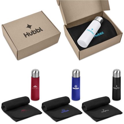 A 500ml stainless steel vacuum flask is paired with a black fleece blanket in a kraft gift box.