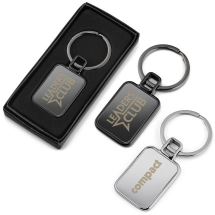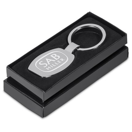This curvy, nickel plated metal keyholder can be elegantly branded by laser engraving, and is presented in a black gift box.