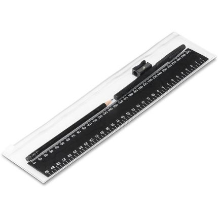 A transparent PVC ziplock pouch with your stationery essentials: a 30cm ruler, a plastic ball pen, a wooden pencil with eraser, and a sharpener.