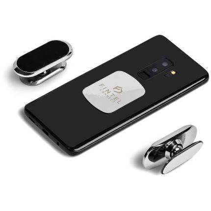 Keep your hands free and your phone securely in the optimal position for viewing maps, with this elegant magnetic phone mount for your car. The mount itself has a 3M tape base to stick securely onto your dashboard. It’s quite a commitment, but you’ll be glad you did it! It has a strong magnet which will secure your phone via the accompanying thin metal plate which sticks to the back of your phone or phone cover. Logo branding is offered on the metal plate.