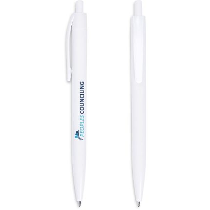 Branding on the white barrel of this economical but reliable ball pen is most effective when matched to the colour of the clip and pusher.
